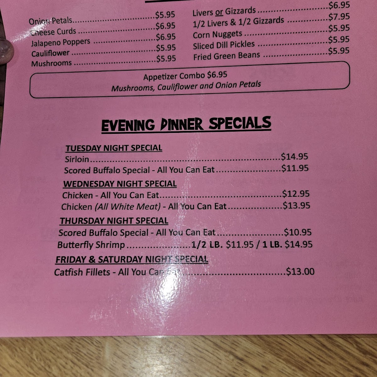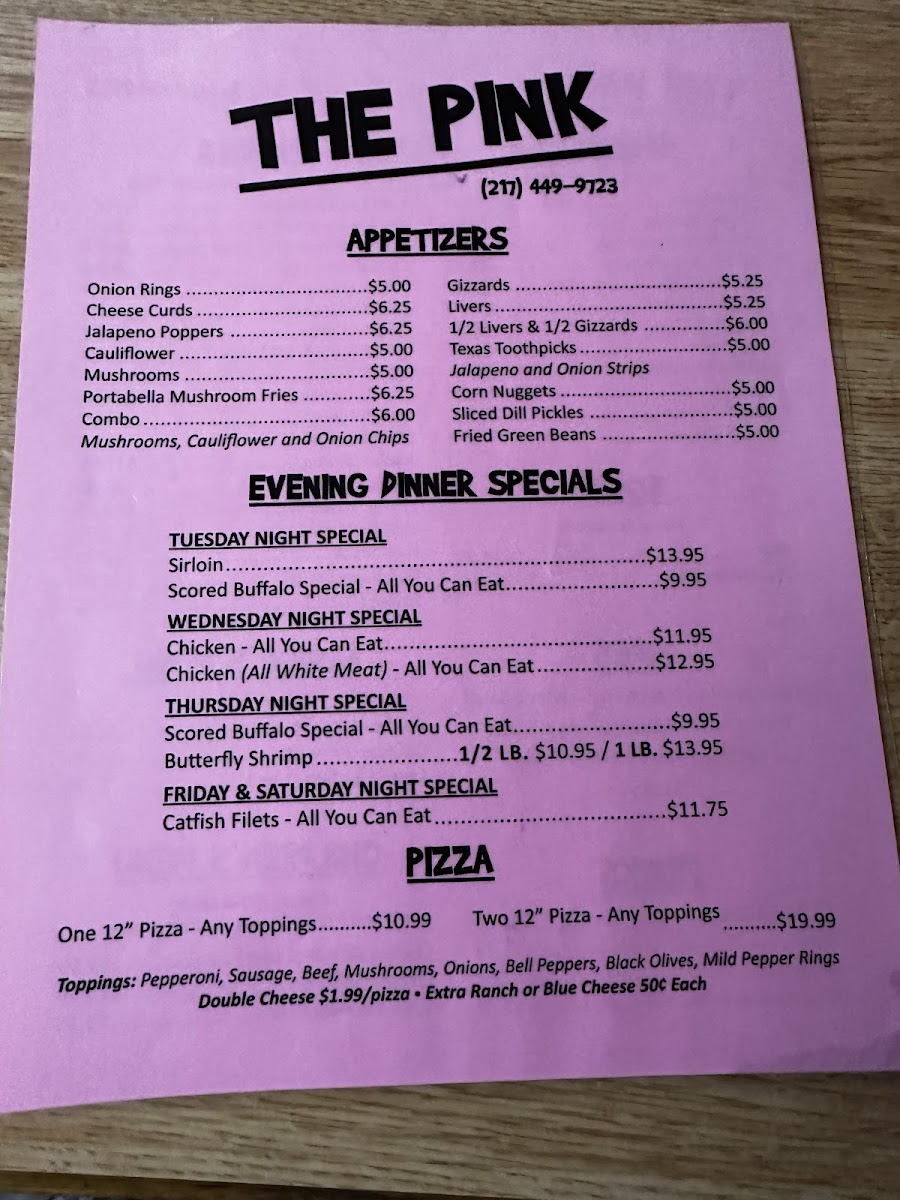 Welcome to Pink Tavern Inc., a charming eatery located in Lomax, Illinois, known for its delightful all-you-can-eat specials. As you step into this inviting tavern at 1010 IL-96, you can expect a savory menu that caters to a variety of tastes. Highlighted by the Thursday night Scored Buffalo Special and the much-loved Catfish Fillets available on weekends, there's something for everyone.